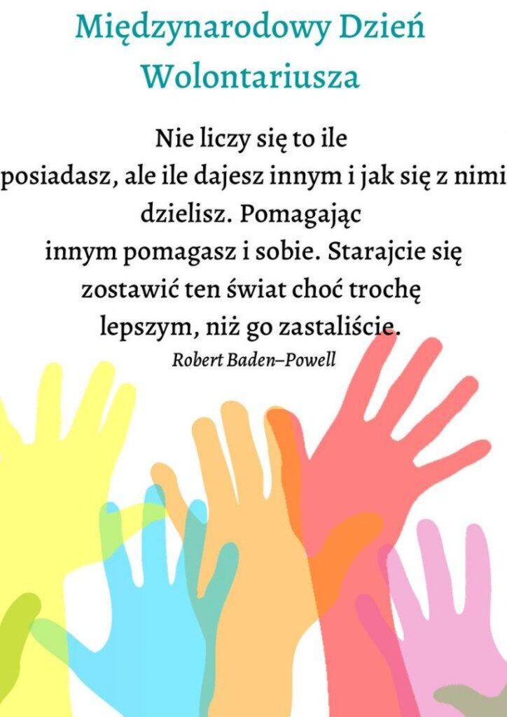 05.12.2025 obchodzony jest Dzień Wolontariusza. W naszej szkole działa koło, skupiające osoby, które w różny sposób chcą pomagać innym. Opiekę nad naszymi wolontariuszami pełni p. Krystyna Felińska.